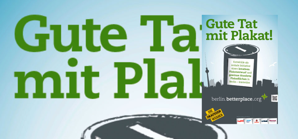 Es handelt sich um eine gemeinschaftliche Aktion von betterplace.org, ein online Spendenportal auf dem soziale Projekte für Spenden aufrufen können und „Die Draußenwerber GmbH“, eine Tochtergesellschaft der Wall AG. Sie stehen hinter dem Plakatwettbewerb, der es sozialen Initiativen ermöglicht ihr Projekt mittels pfiffigen Plakatkreationen im Stadtbild zu bewerben. Die genauen Teilnahmebedingungen findest du am Anschluss zu diesem Eintrag unter Quellen und Linkempfehlung.